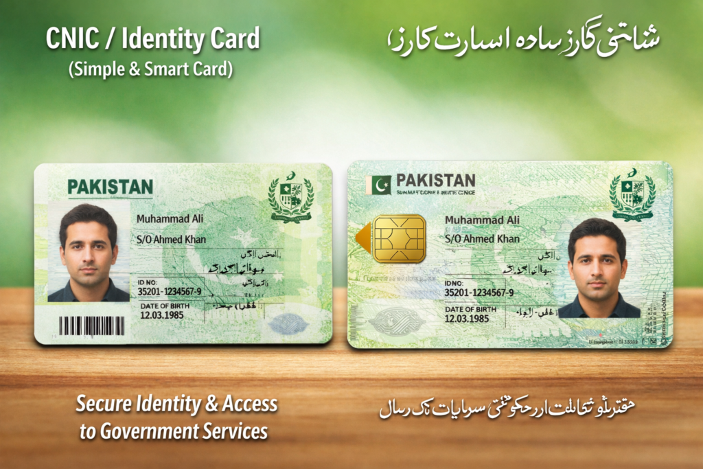 CNIC is an official identity card issued for citizen verification and legal purposes. Simple and Smart Cards ensure secure identification and access to government services.